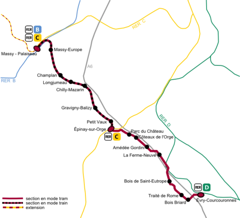 D’Epinay-sur-Orge à Evry, les rames circulent sur voirie, sur une nouvelle voie tram longue de 10,3 km avec 9 stations et une vitesse commerciale de 25 km/h est attendue.